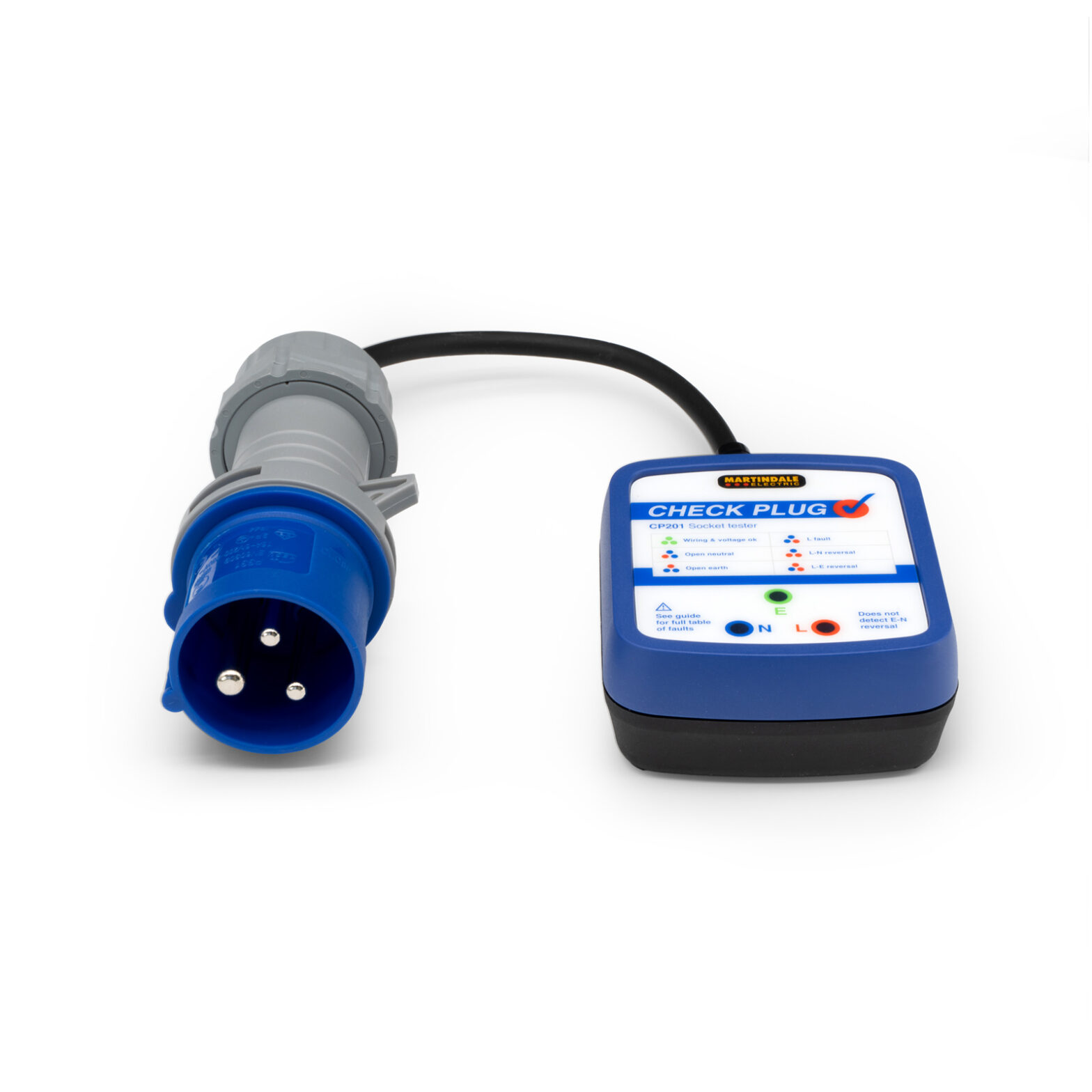 The Martindale CP201-16A is a socket tester for industrial single-phase sockets identifying up to 28 fault conditions.