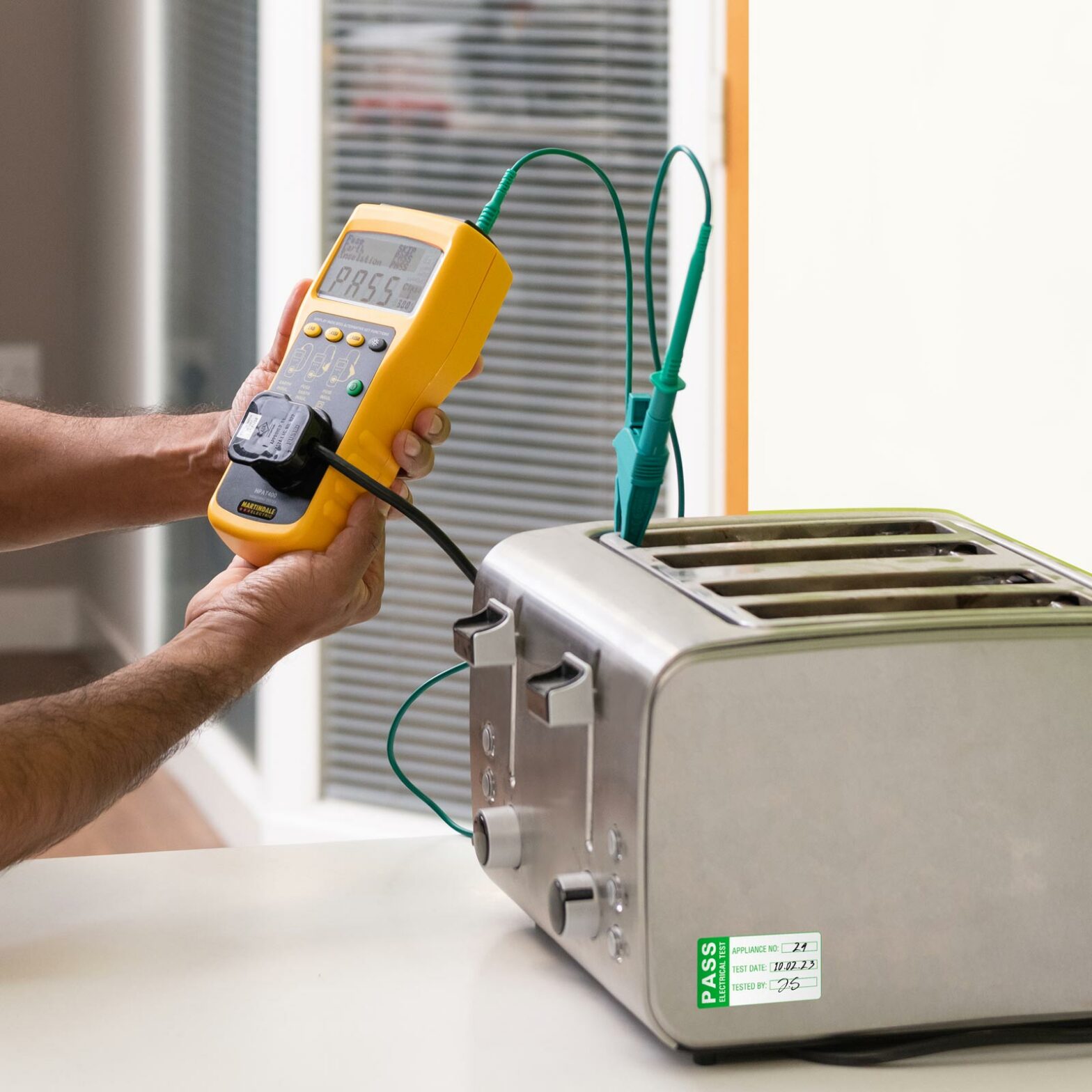 These large green paper pass labels indicate an appliance has passed its portable appliance test. The label carries the appliance number, ‘Date of test’ and ‘Tested by’ information.