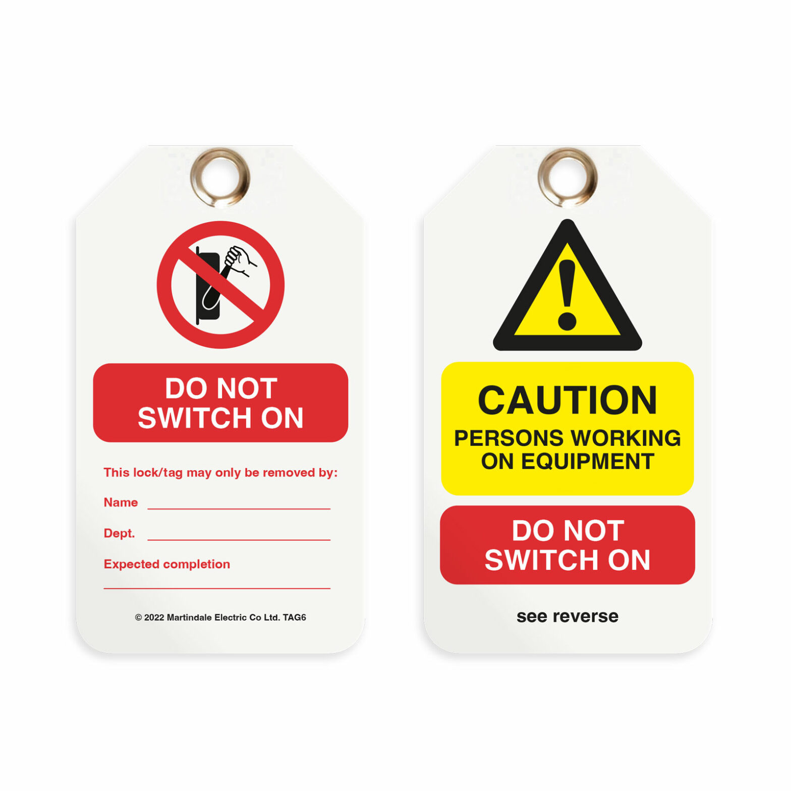 Martindale’s TAG6 tags give a highly visible warning to others that an engineer has isolated and locked off a circuit or equipment for safety and extreme caution should be observed, they give a clear ‘Do Not Switch On’ instruction. The tags also incorporate a highly visible and recognisable yellow warning triangle.