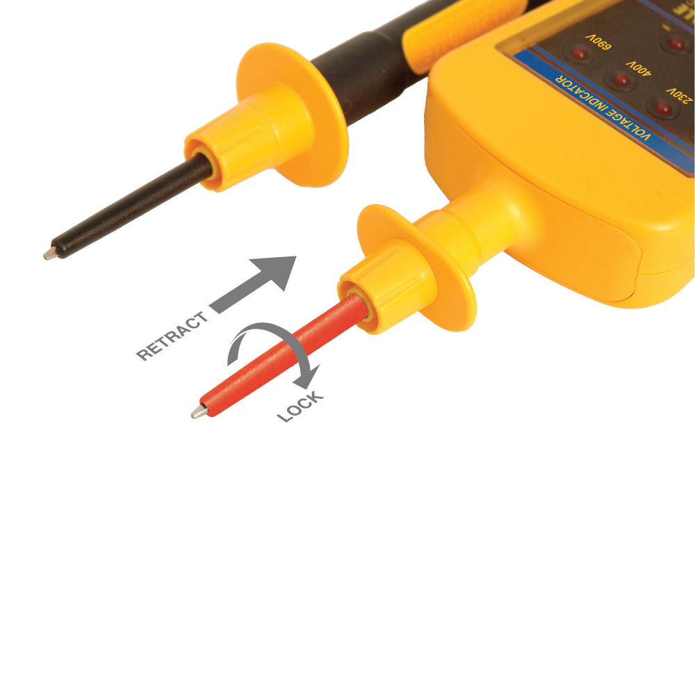 Fully compliant with HSE GS38, the VI15000 comes complete with heavy-duty, two–layered double-insulated leads with a contrasting inner sheath to easily highlight cable damage. The tester features bright LEDs to clearly identify the voltage at five levels, with thresholds up to 690V. The indicator, which requires no batteries, will identify both AC and DC sources and show polarity.
